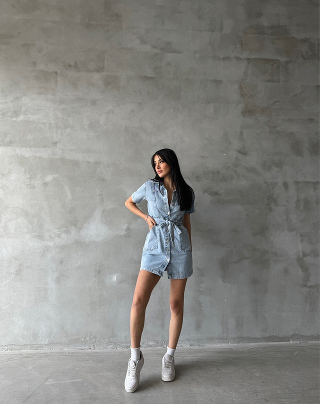 Yakalı Önü Düğmeli Jean Kemerli Elbise
